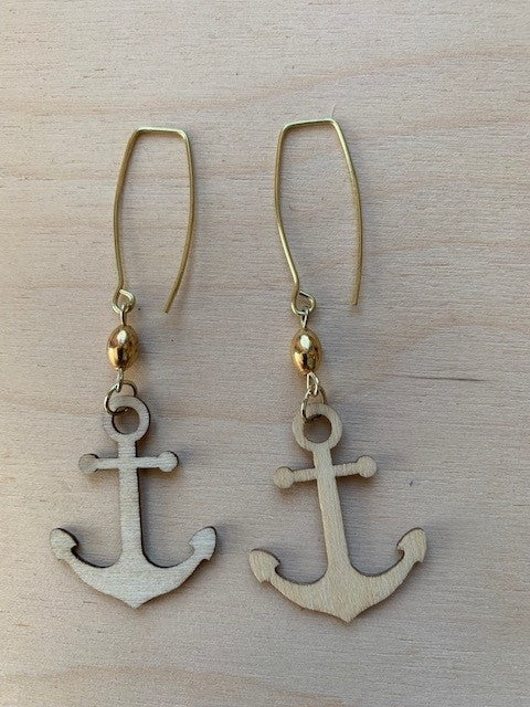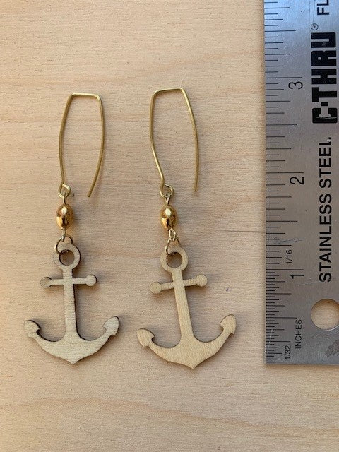 Wood laser cut leaf with solid brass bead and hand formed solid brass earring holder.