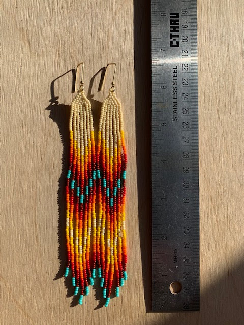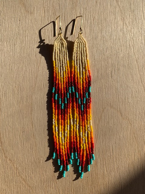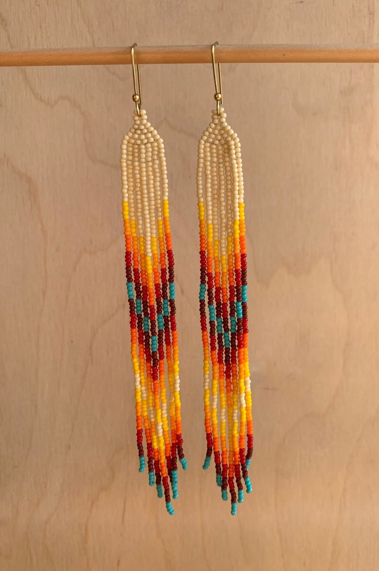bone white, green turquoise and colored glass seed beads with solid brass bead on solid brass earring holder, nickel free.