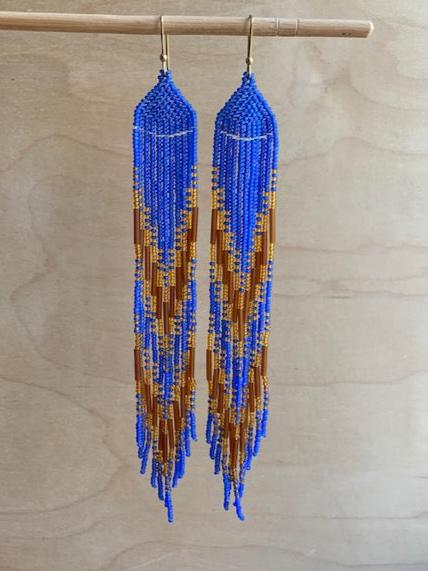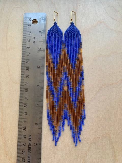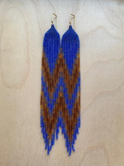 transparent medium blue glass seed beads with transparent light and dark topaz seed beads and solid brass hand-formed earring holders with solid brass bead.