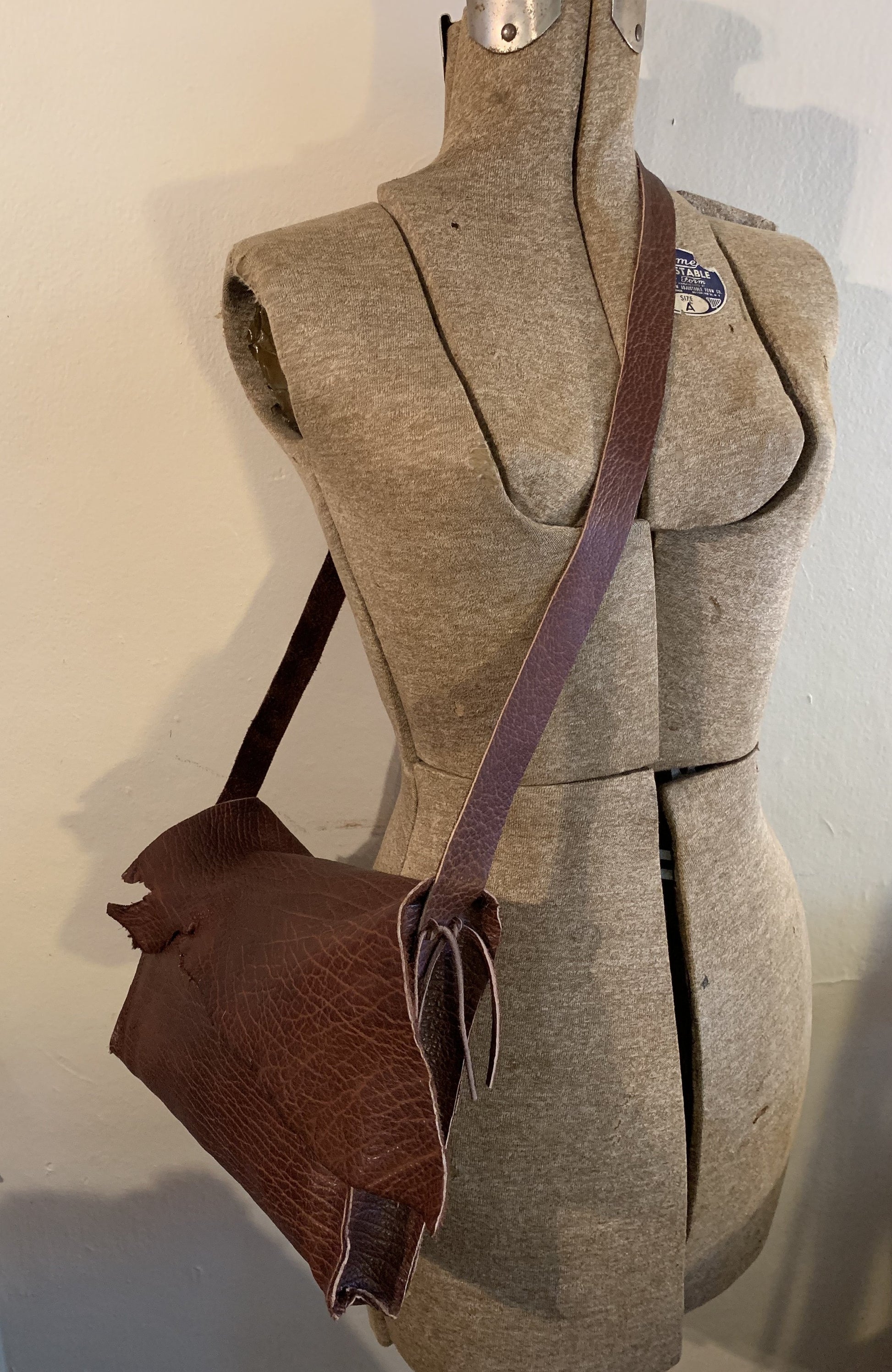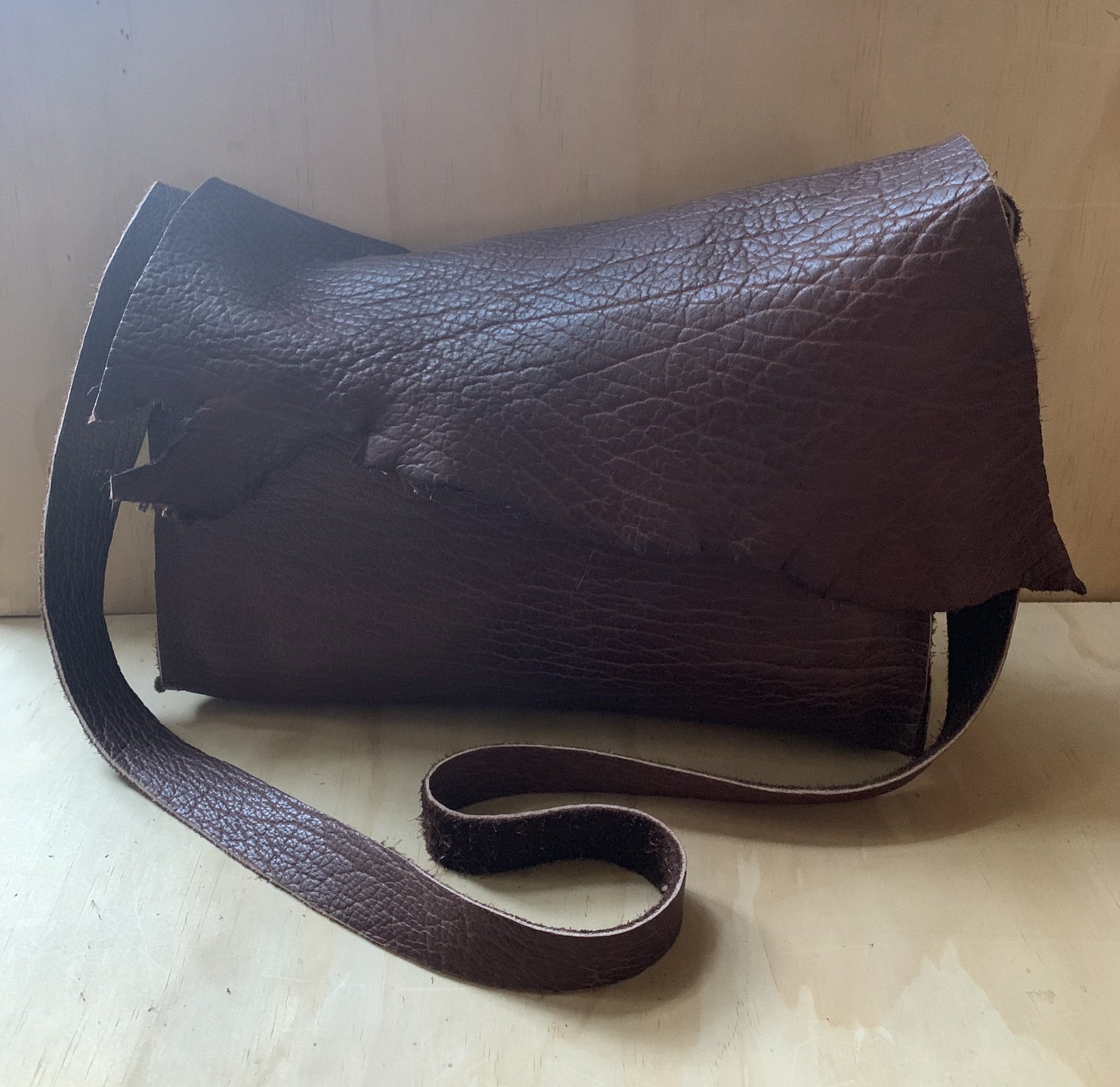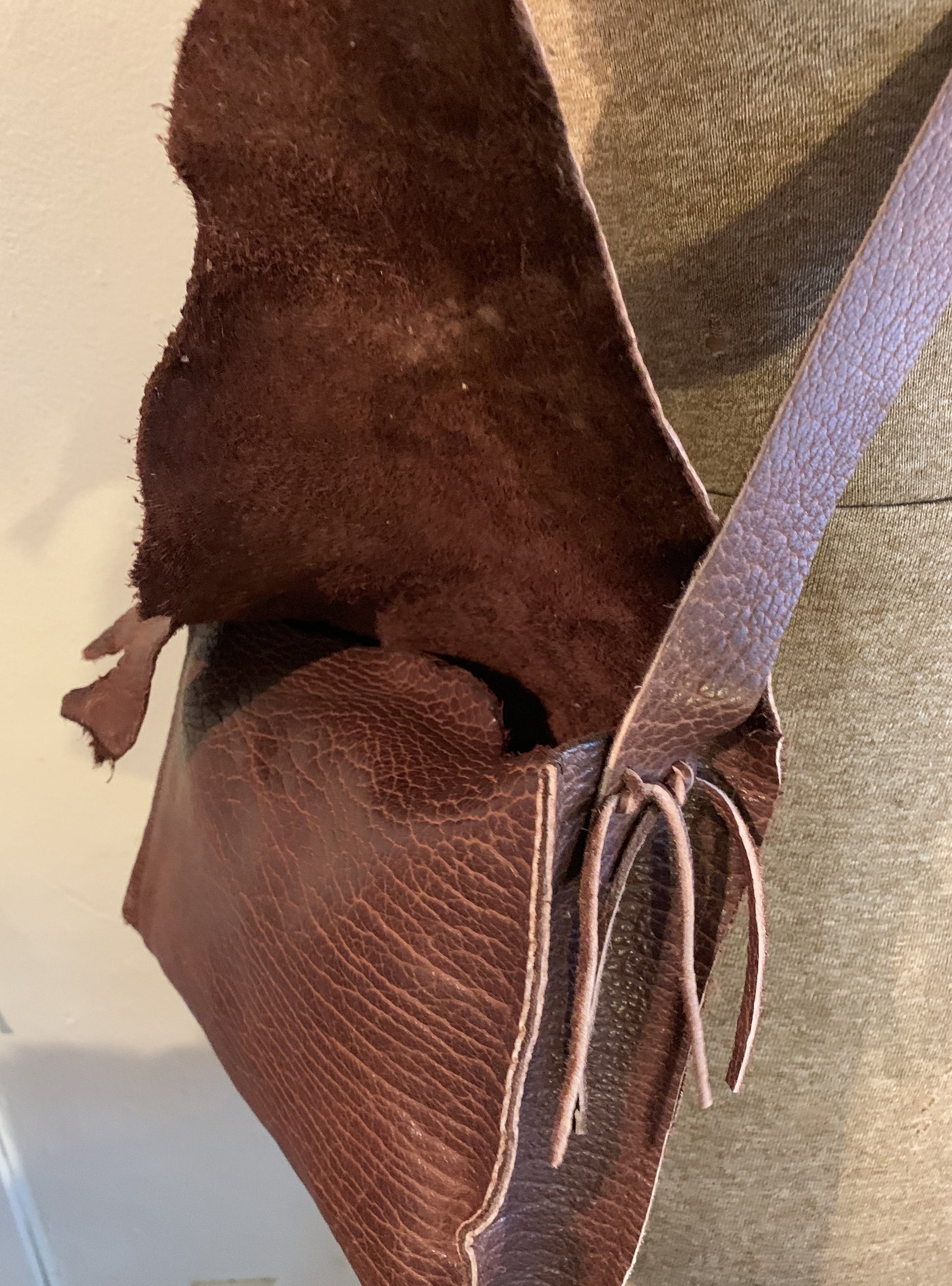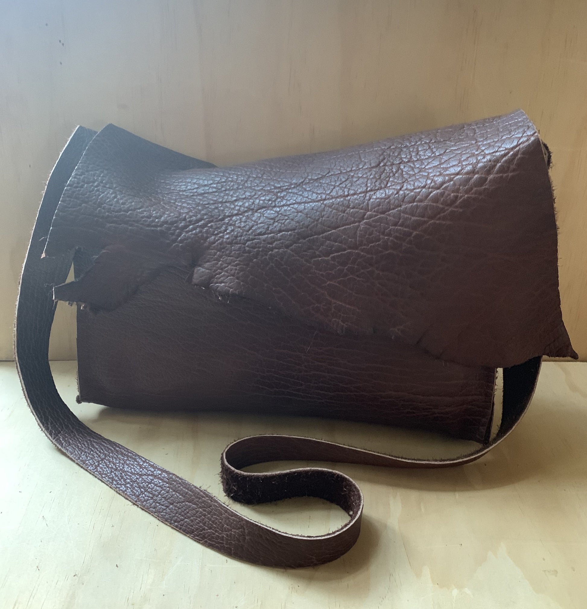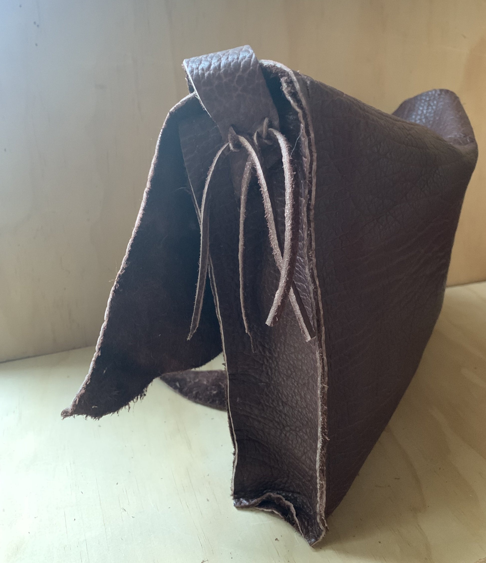 Made from shrunken buffalo leather. This is a traditional method of tanning where the hide is stretched over a fire pit causing the hide to shrink and create a wrinkled look on the hide.