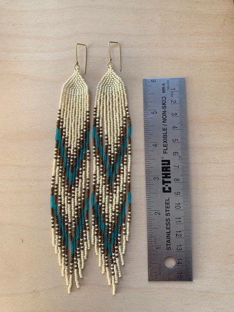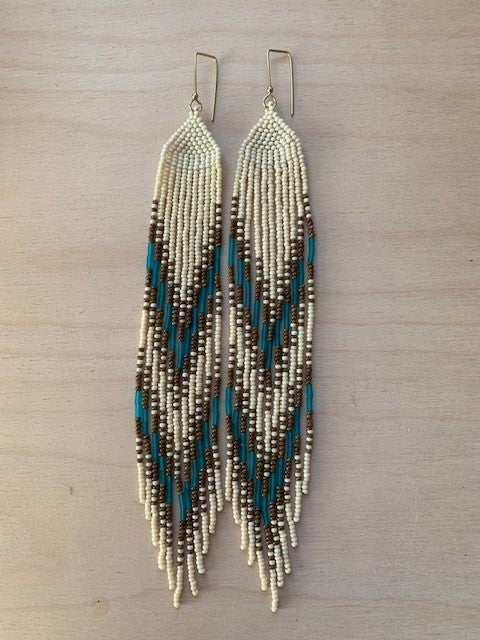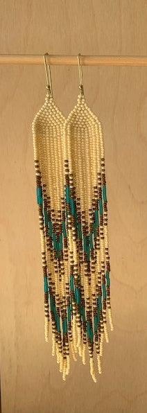 Bone-white, brown travertine, and blue glass beads, and solid brass bead on hand formed solid brass earring holder, nickel-free.