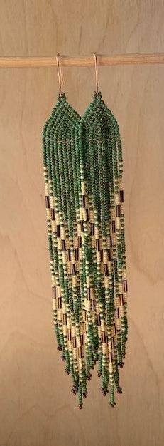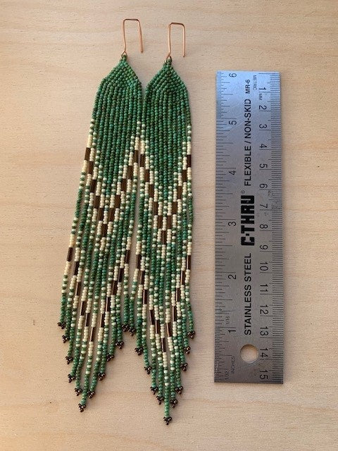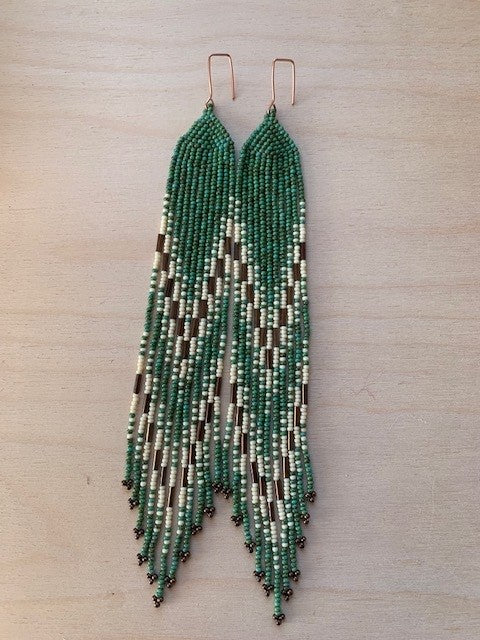 Green travertine, bone-white, and copper glass beads, on hand formed solid copper earring holder, nickel-free.