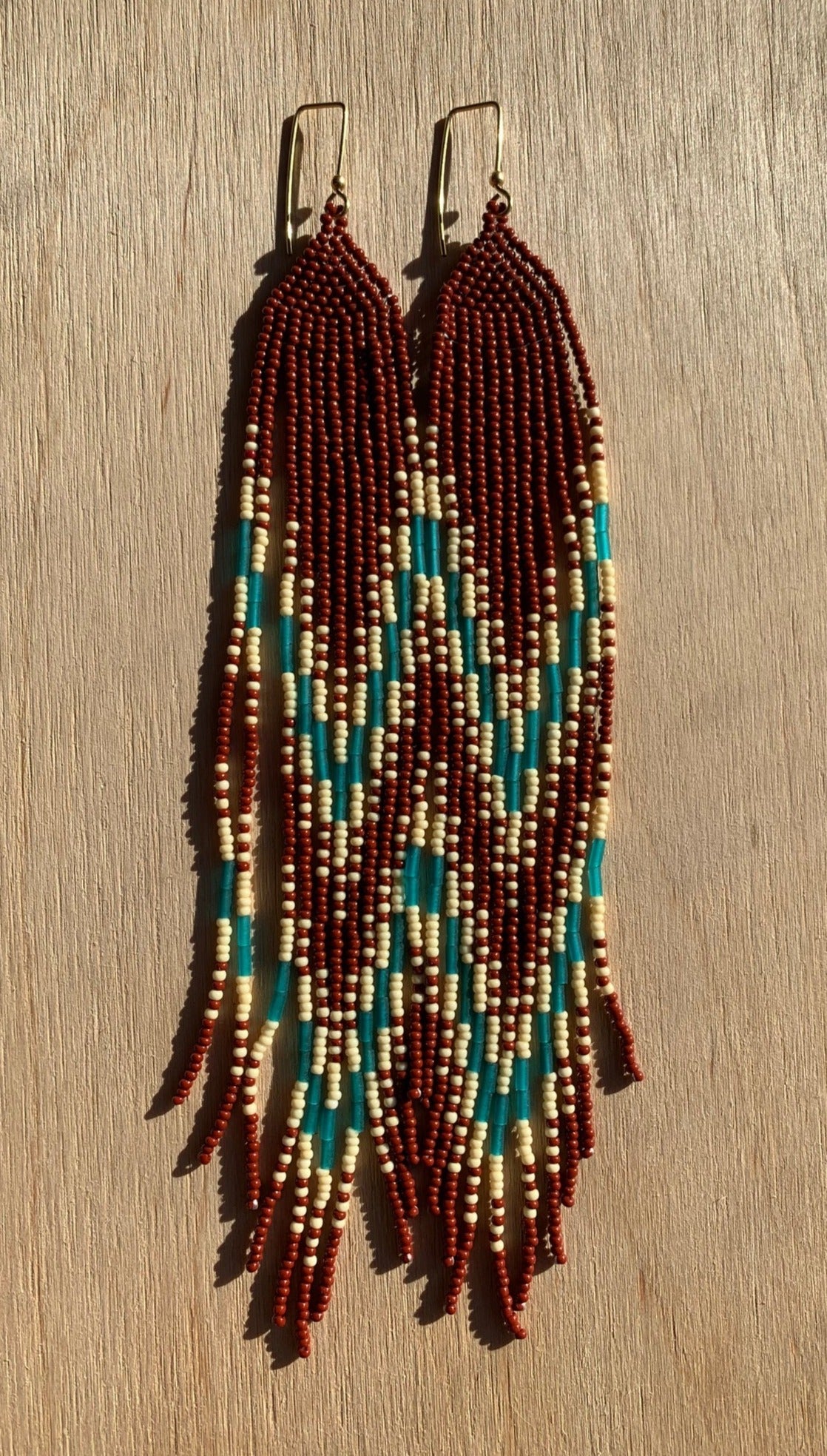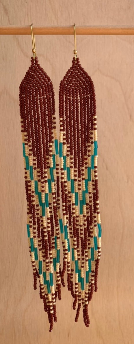 Brown, bone-white, and blue glass beads, and solid brass bead on solid brass earring holder, nickel-free.