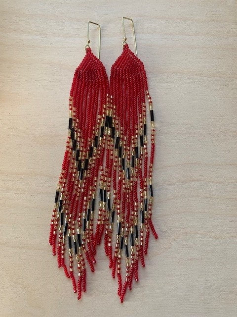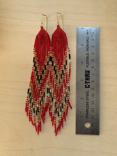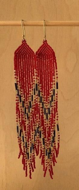 Dark red transparent, light topaz transparent, and black glass beads, with solid brass bead on hand formed solid brass earring holder, nickel-free.