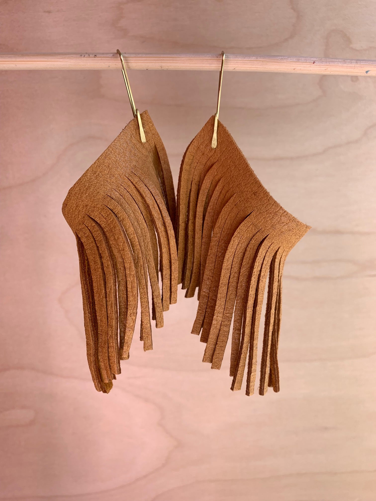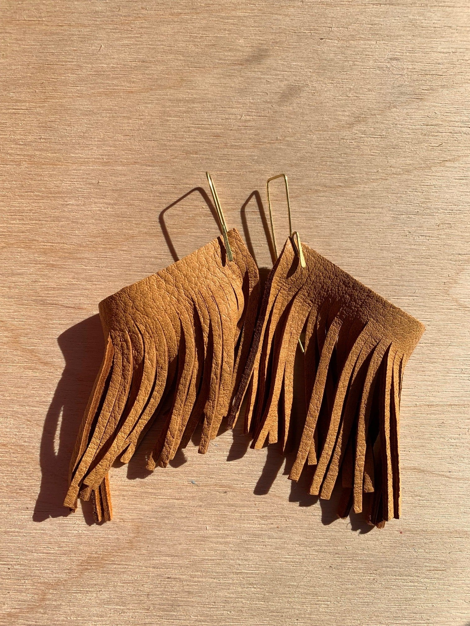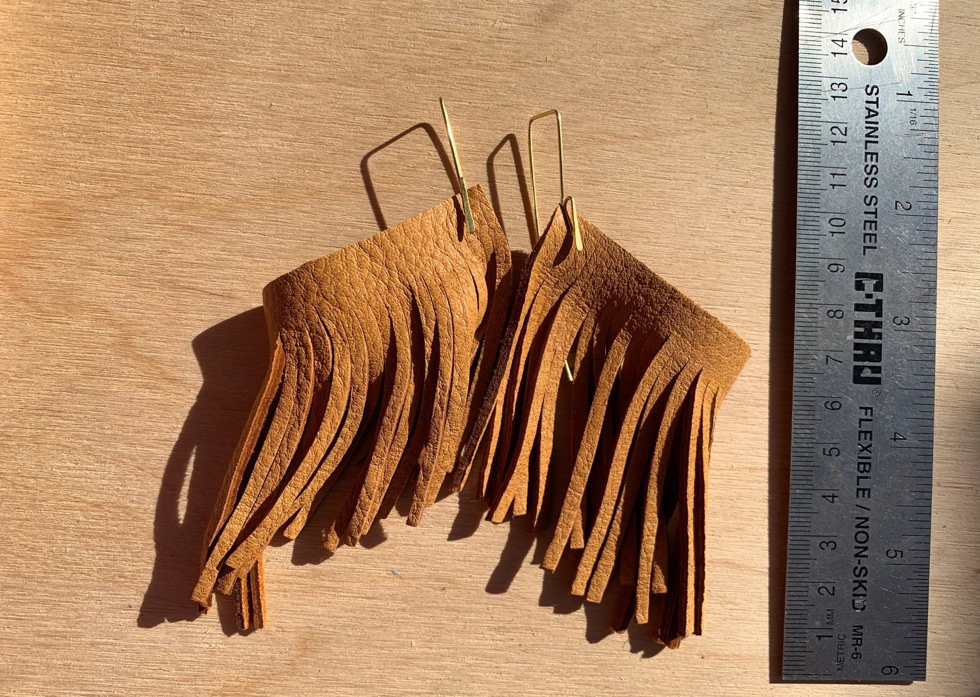 Made from hand cut acorn Deer leather with hand hammered solid brass.