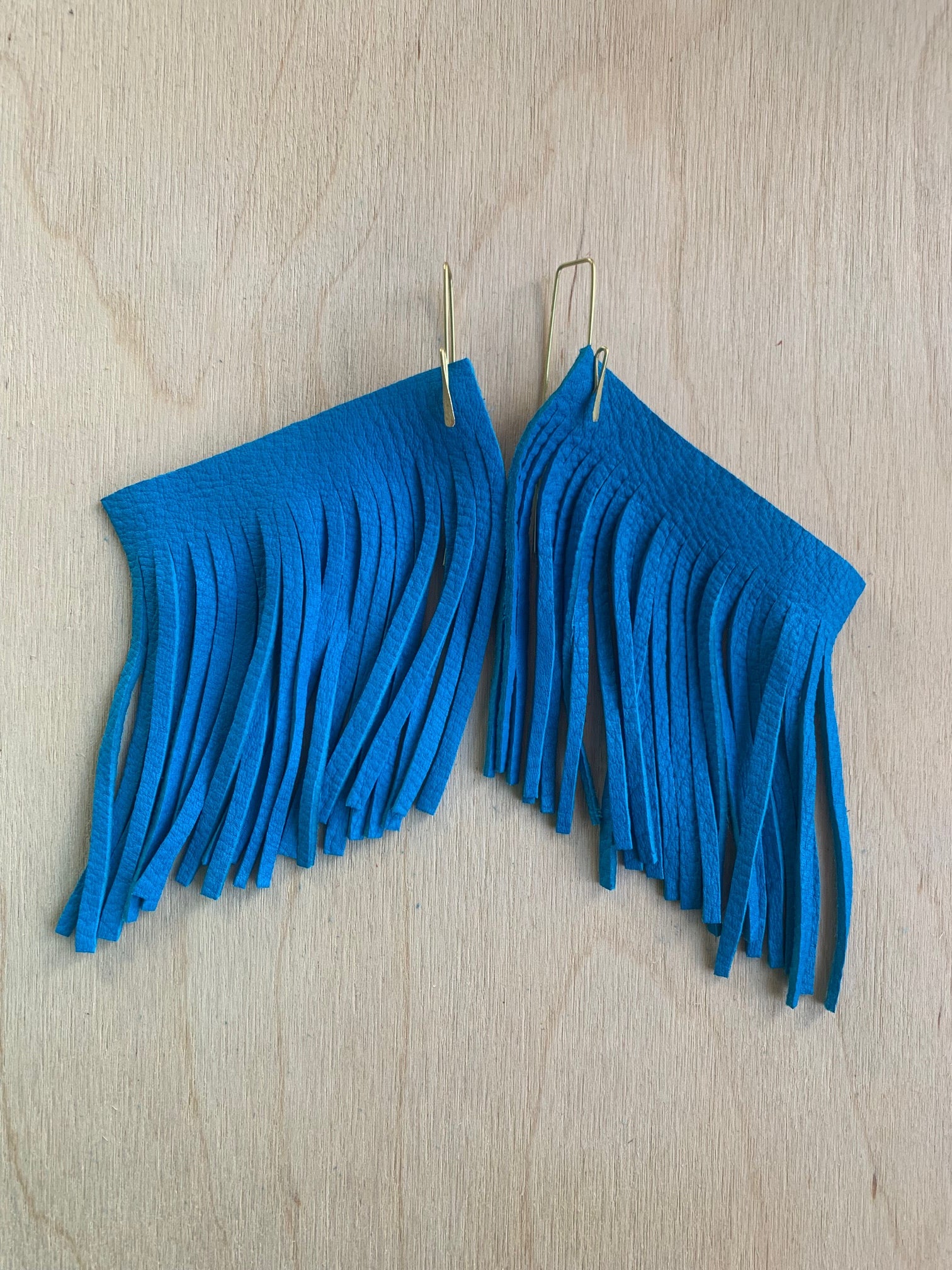 Made from hand cut turquoise Deer leather with hand hammered solid brass.