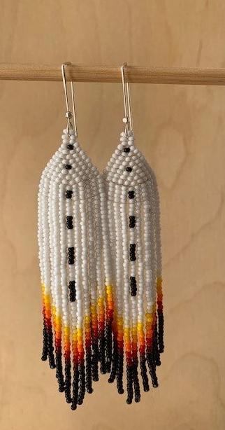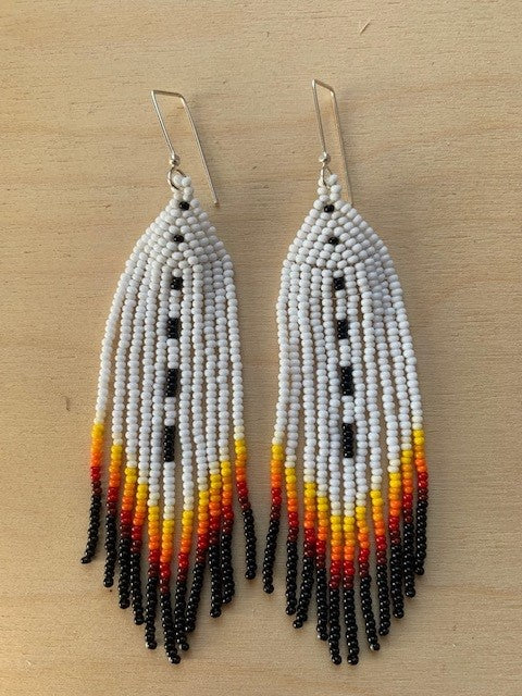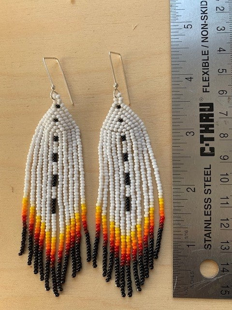 White, black and colored glass beads, with sterling silver bead on hand formed silver plated copper earring holder, nickel-free.