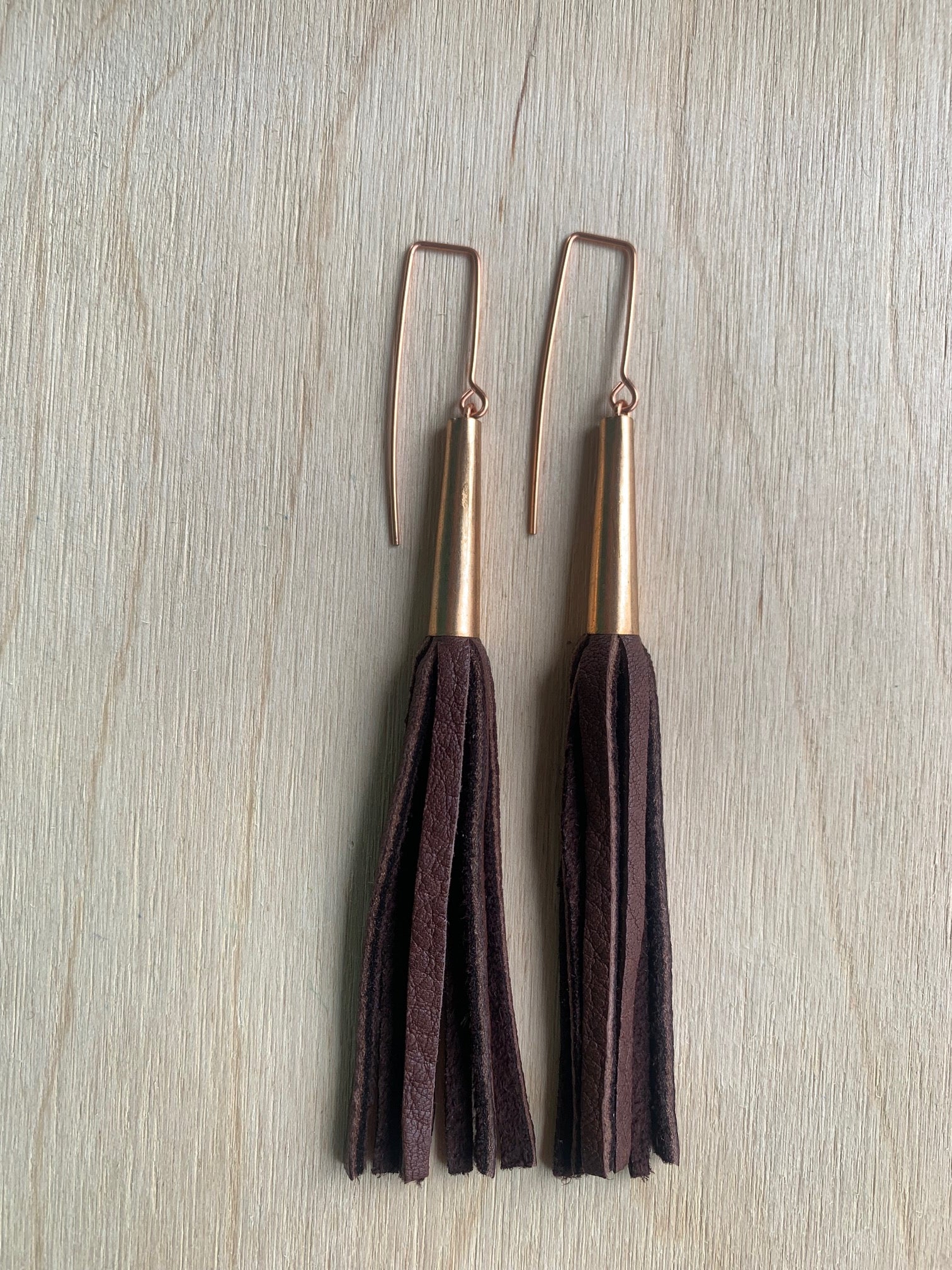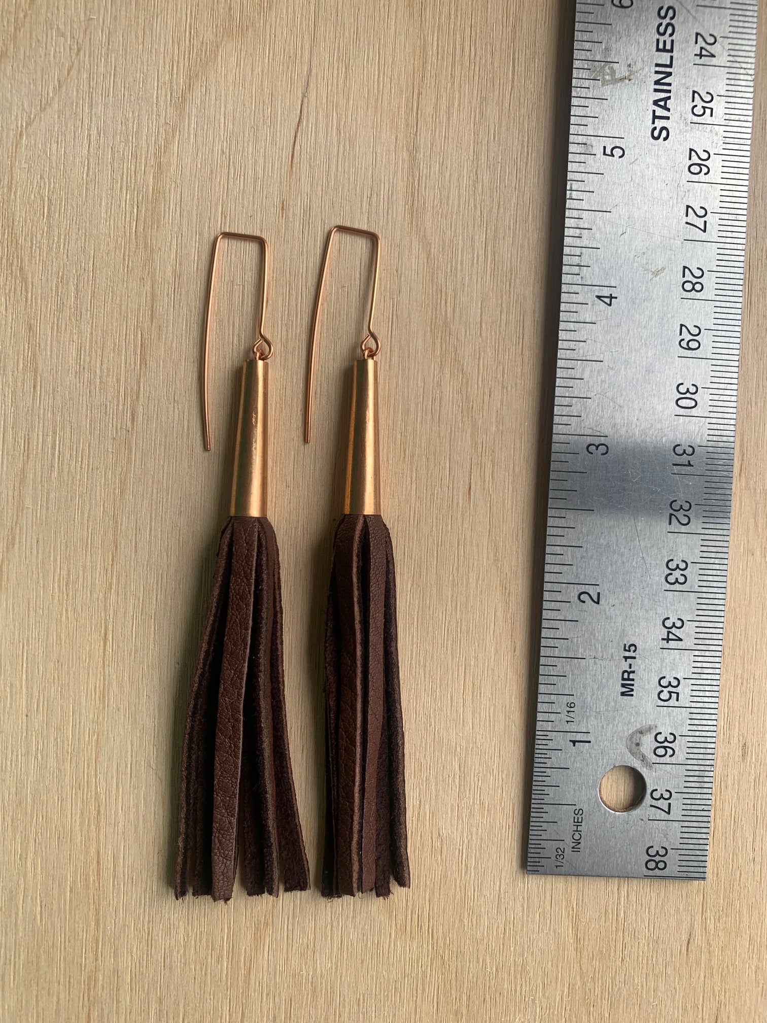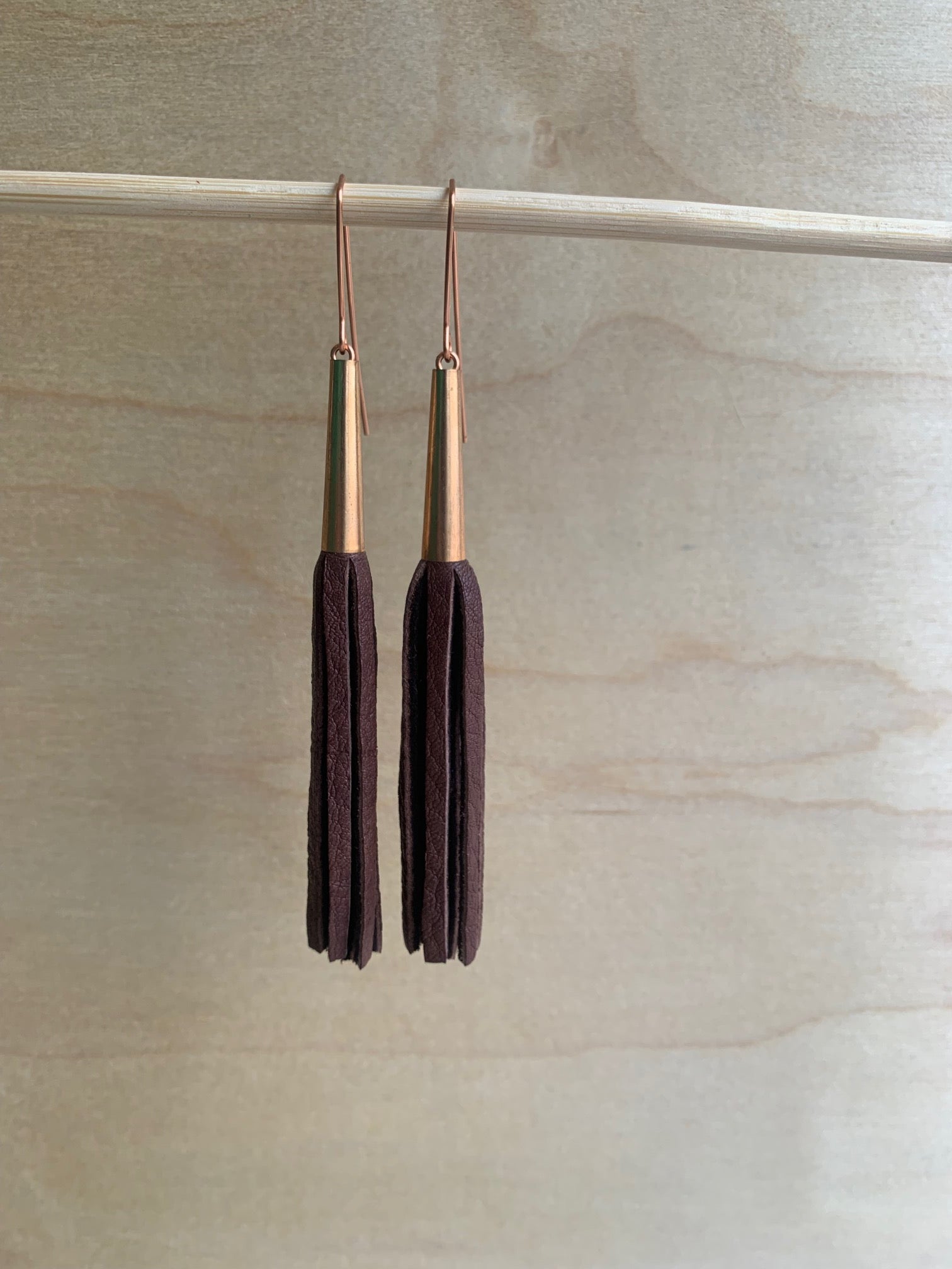 made from hand cut chocolate colored Deer leather and hand formed solid brass earring holders and solid brass cones.