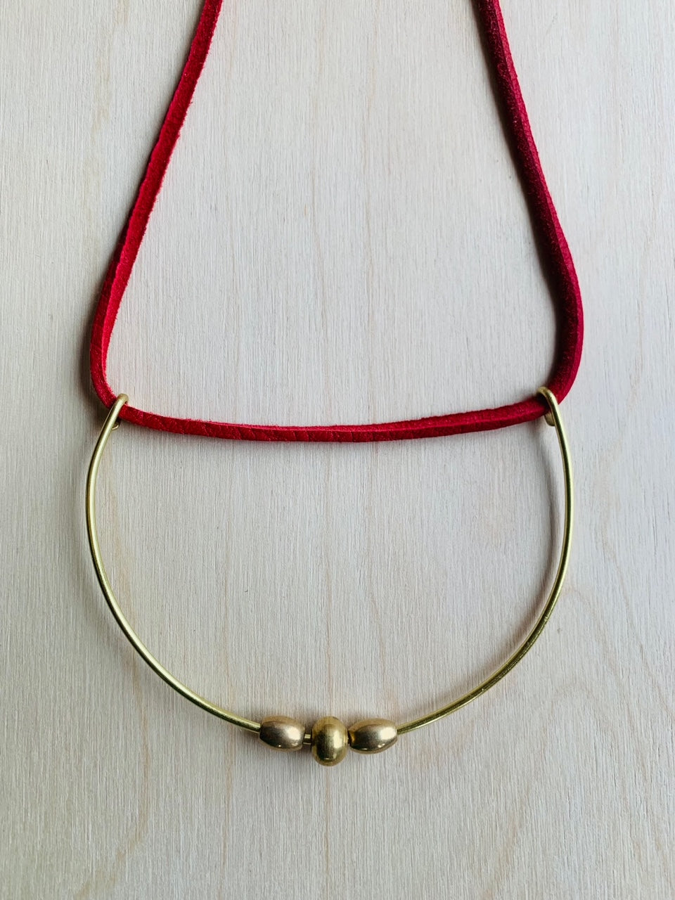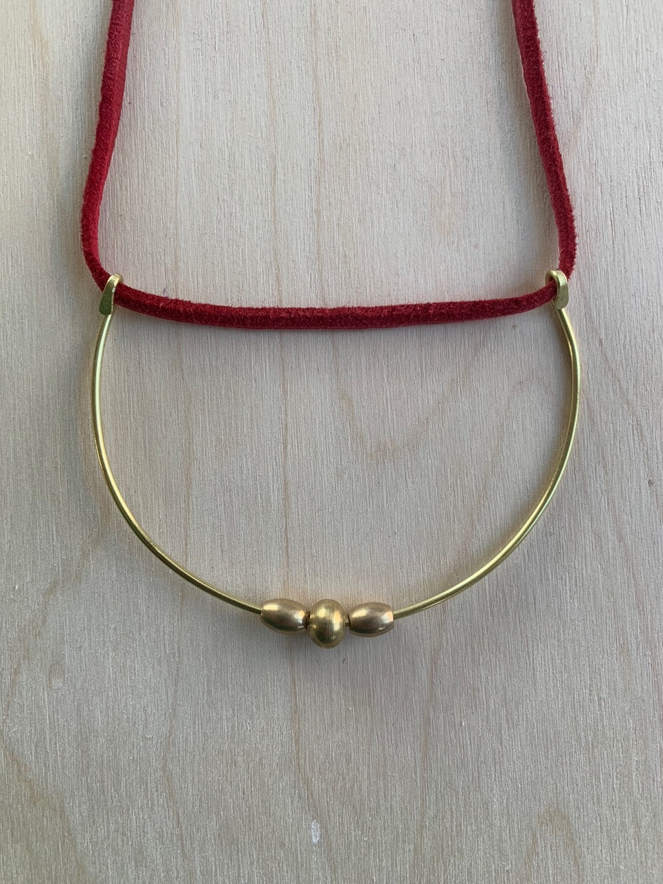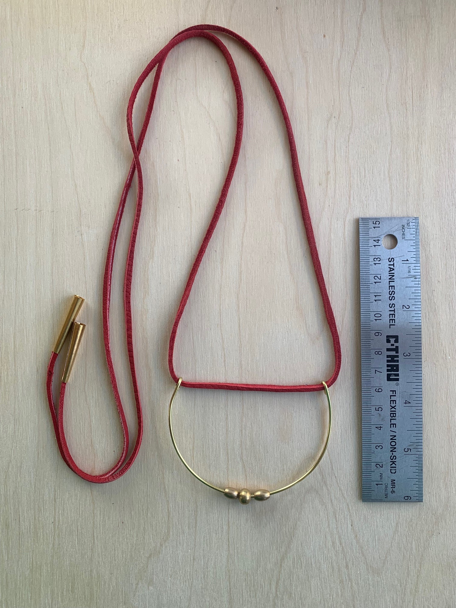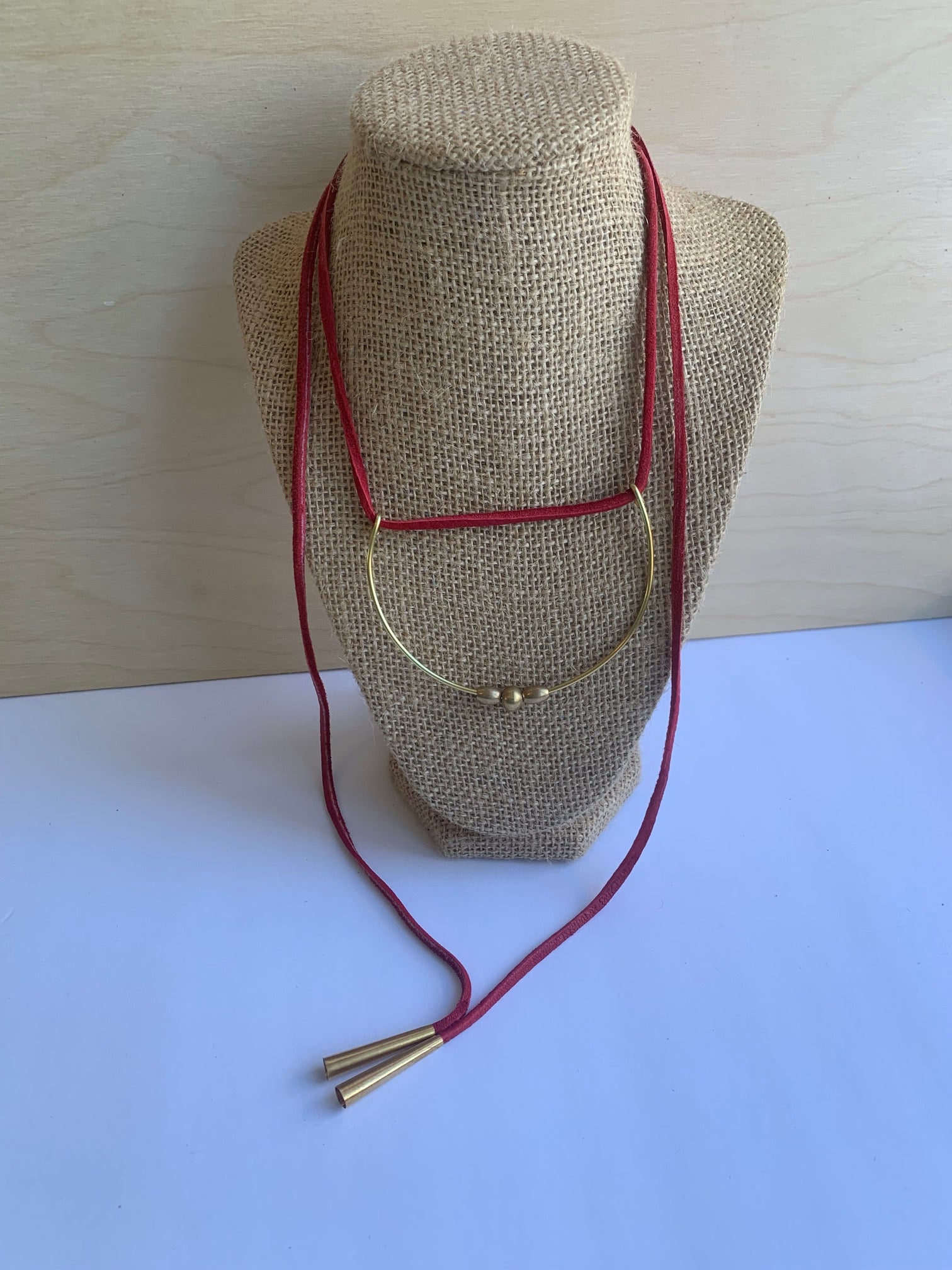 Made from hand hammered solid Brass, red colored Deer leather, solid brass beads, and solid Brass cones.