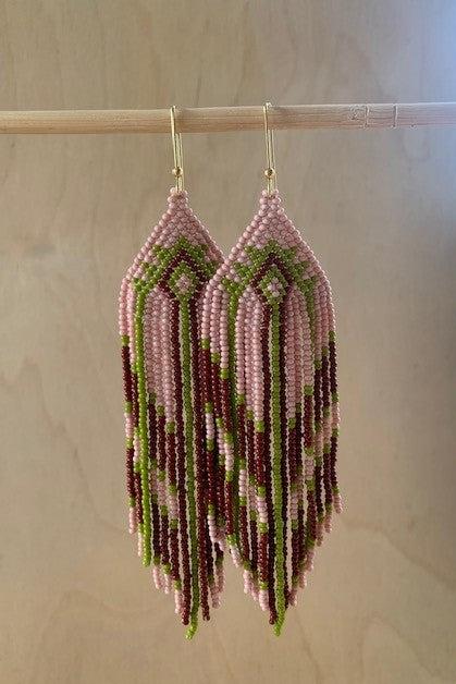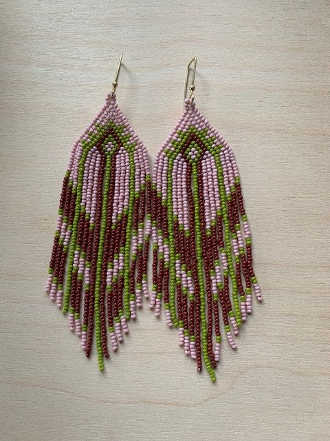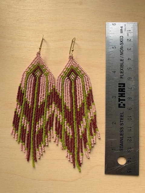 Mauve pink, olive green, and brown glass seed beads with solid brass bead on solid brass earring holder, nickel-free, and brass bead.