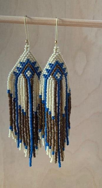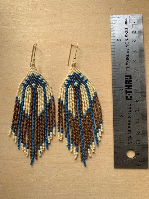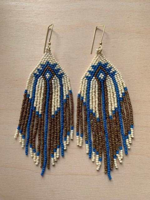 Travertine brown, bone-white, and slate blue glass seed beads with solid brass bead on solid brass earring holder, nickel-free, and brass bead.