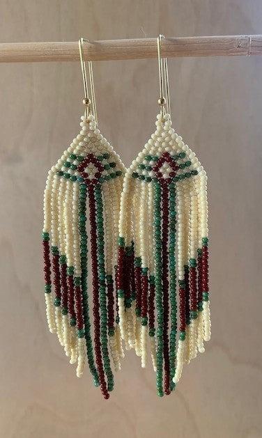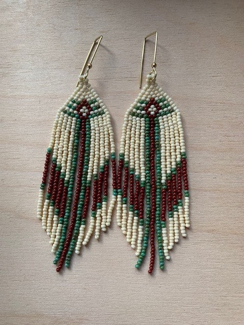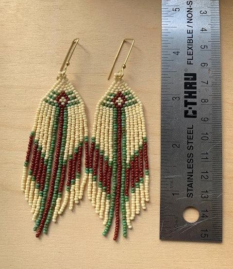 Travertine green, bone-white, and brown glass seed beads on solid brass earring holder, nickel-free, and brass bead.