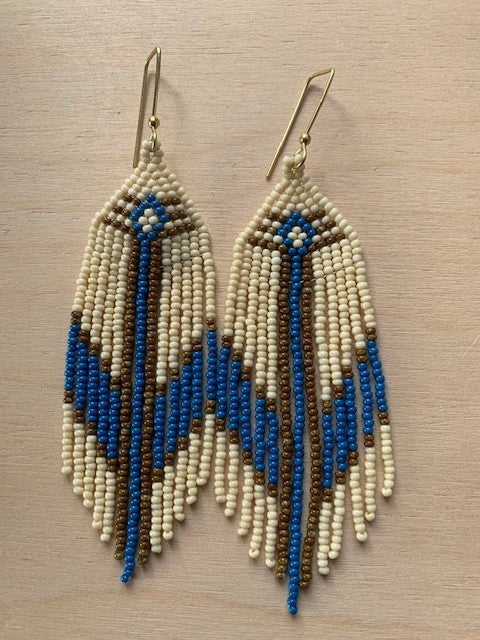 Travertine brown, bone-white, and slate blue glass seed beads on solid brass earring holder, nickel-free, and brass bead.