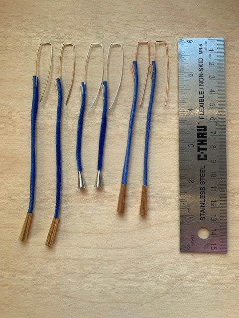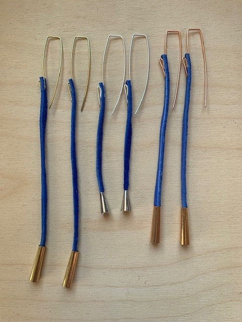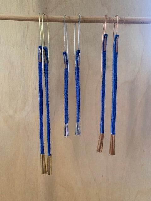 Long - Made of blue colored Deer leather with solid brass cones and hand formed & hammered solid brass.