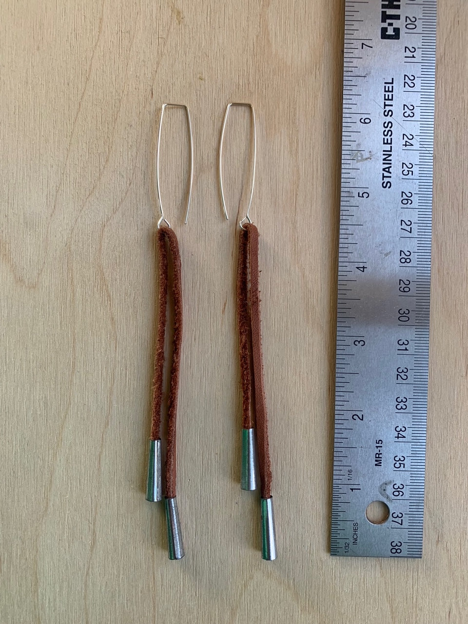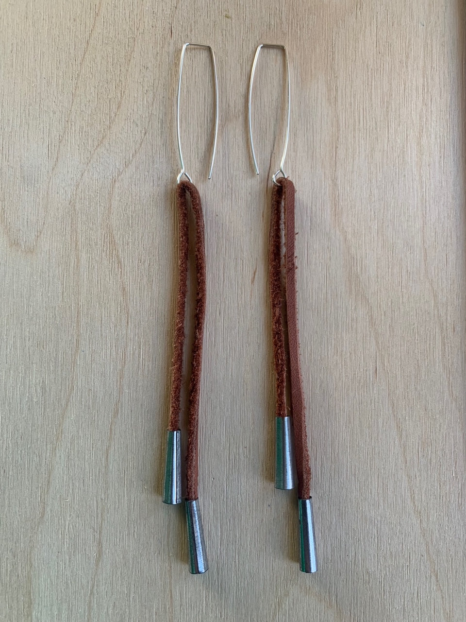 made from chocolate Deer leather with tin cones and hand formed & hammered silver-plated copper earring holders. the tin does rust which is the old school way.