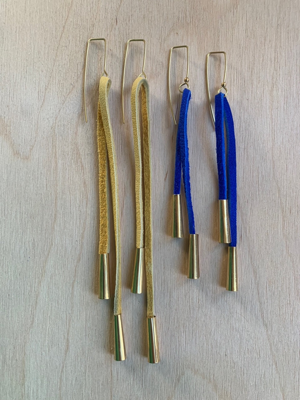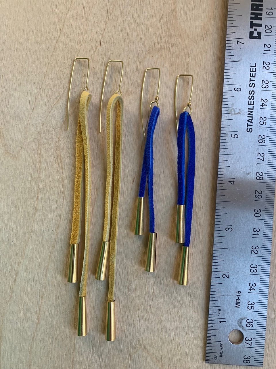 made from gold/yellow or blue deer leather and solid brass cones and hand formed & hammered solid brass earring holders. the blue have a solid brass bead.
