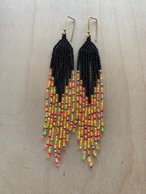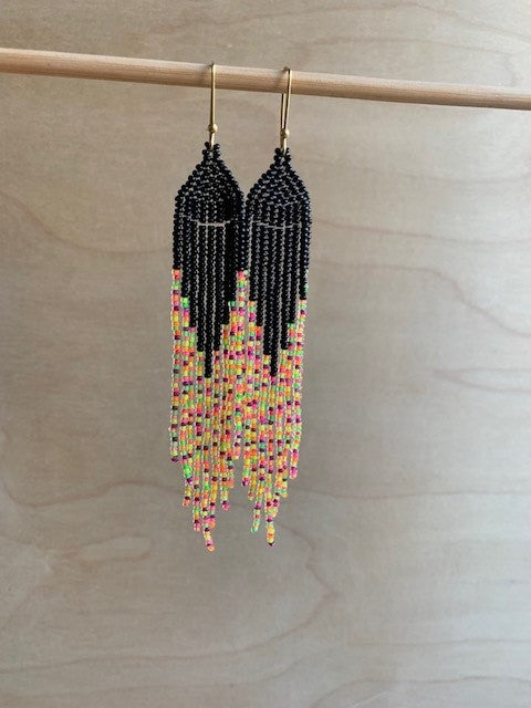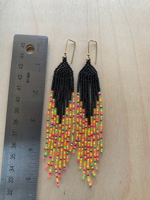 black glass seed beads with multicolor neon glass seed beads and solid brass hand-formed earring holders with solid brass bead.