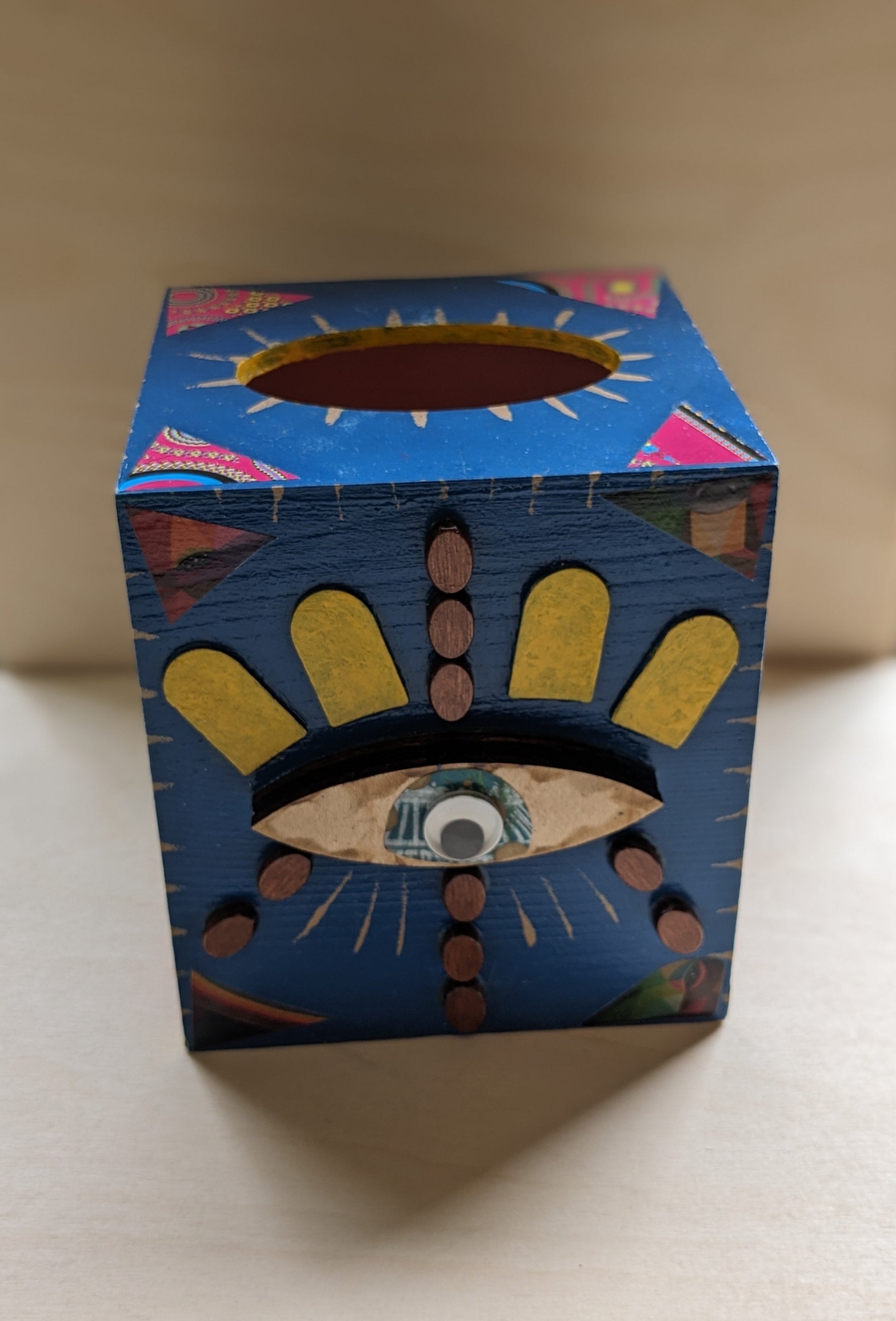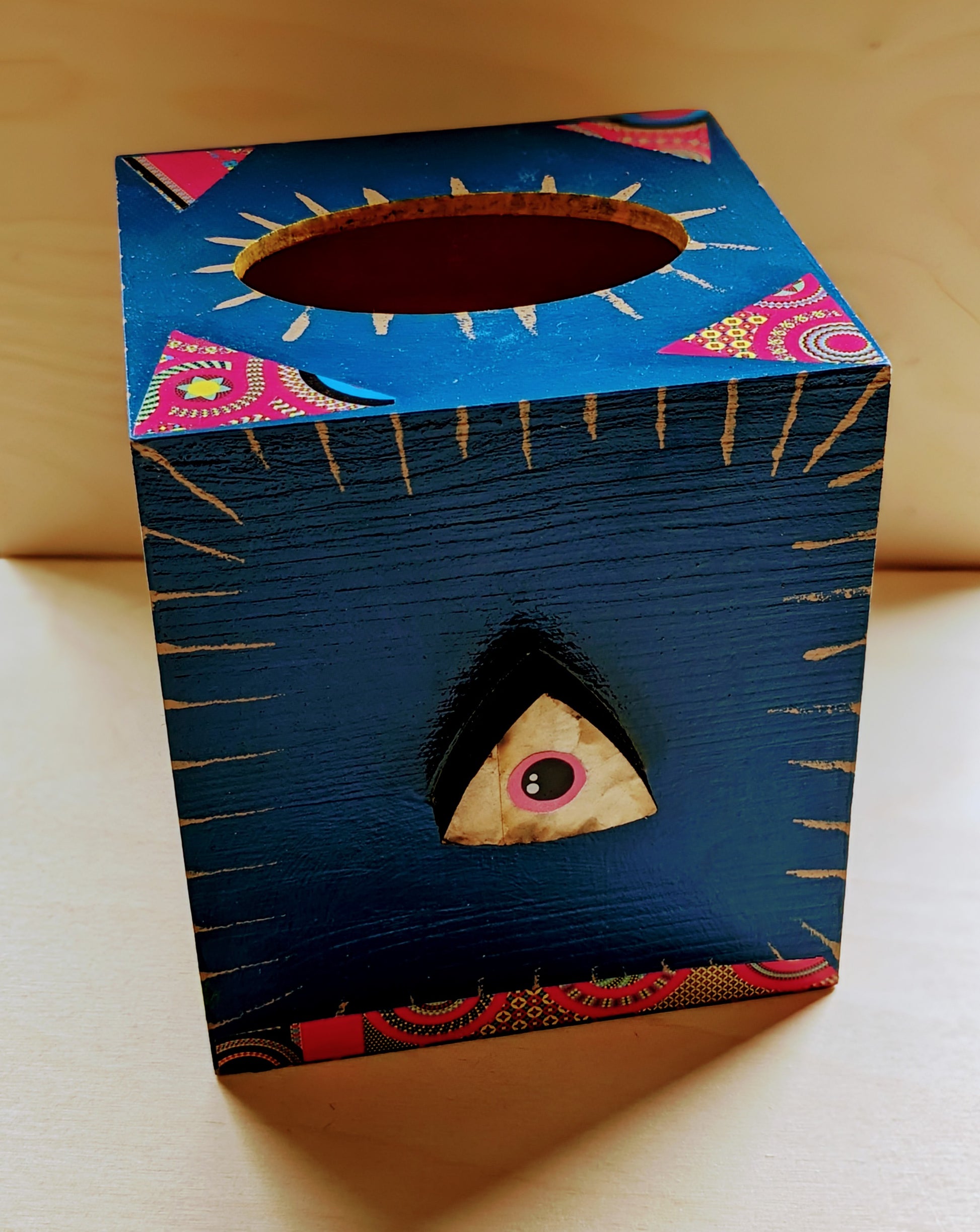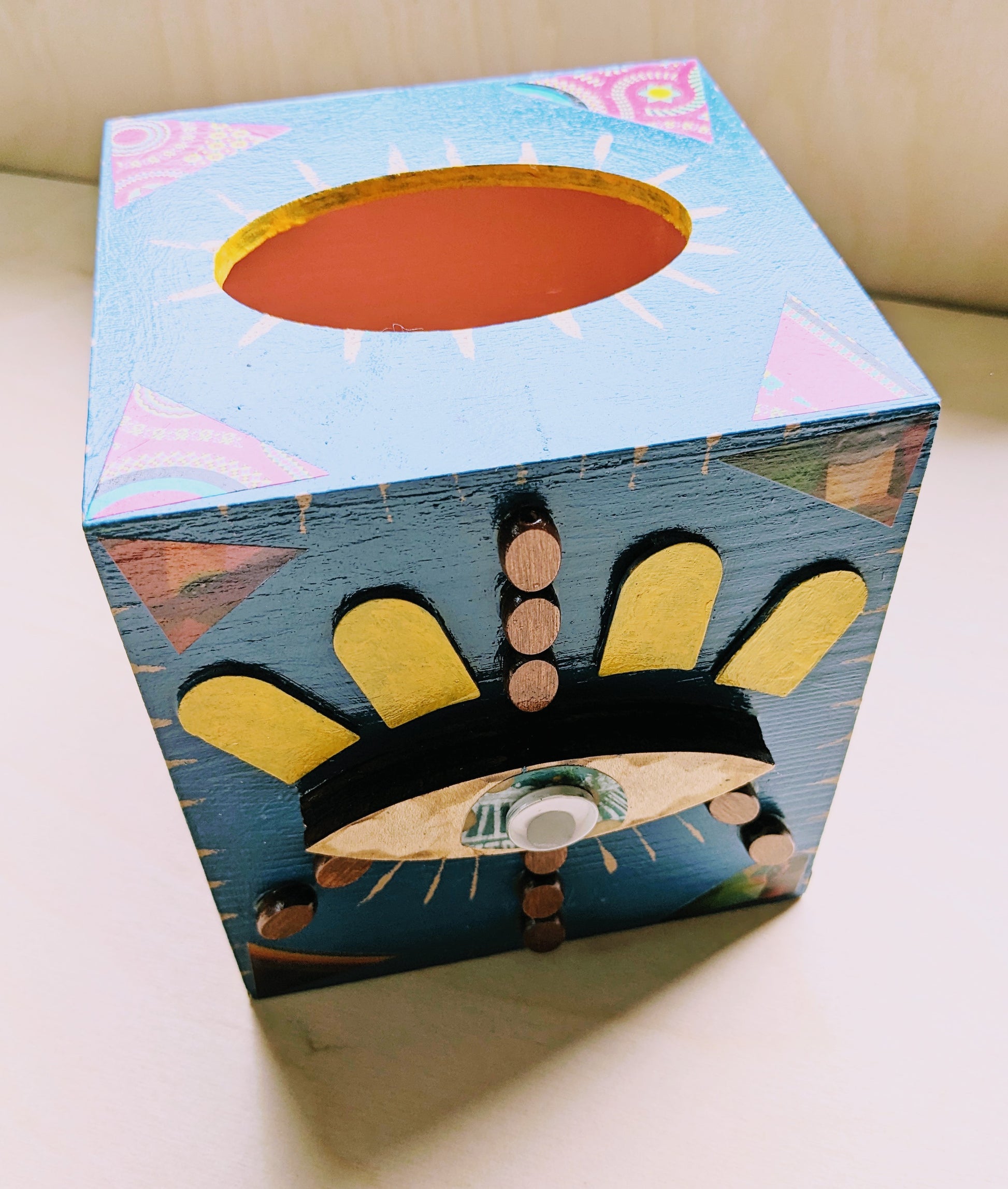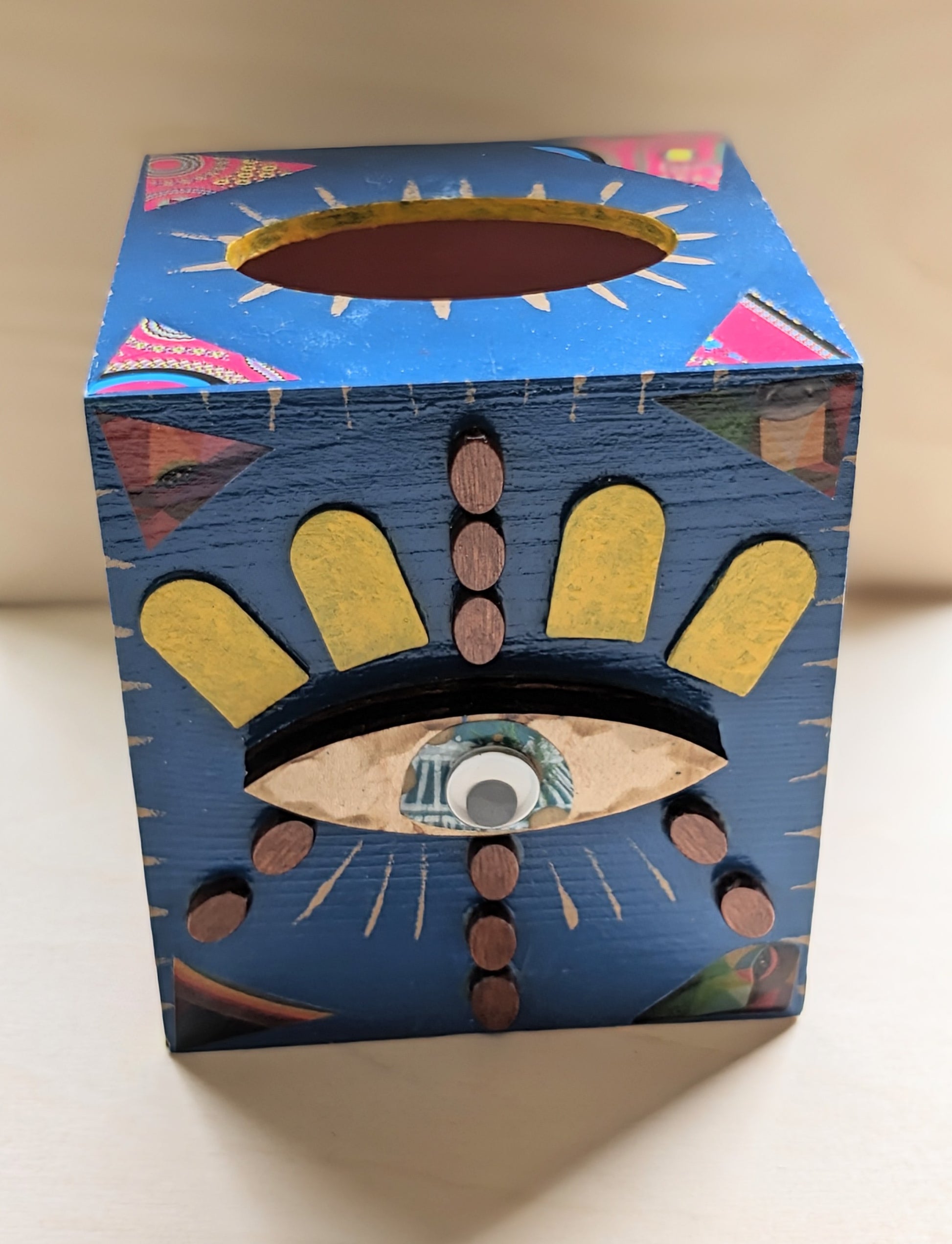 Wood painted mixed media tissue box- Blue mood mosaic eye