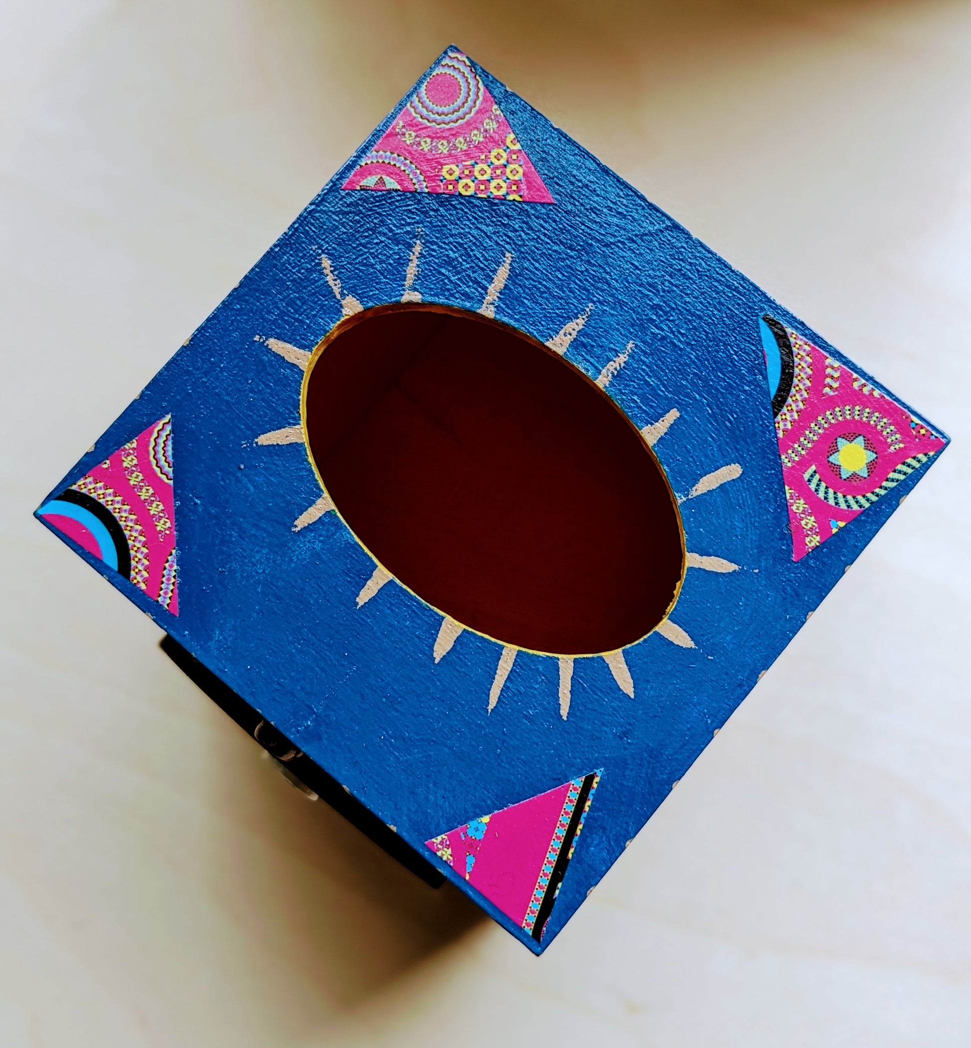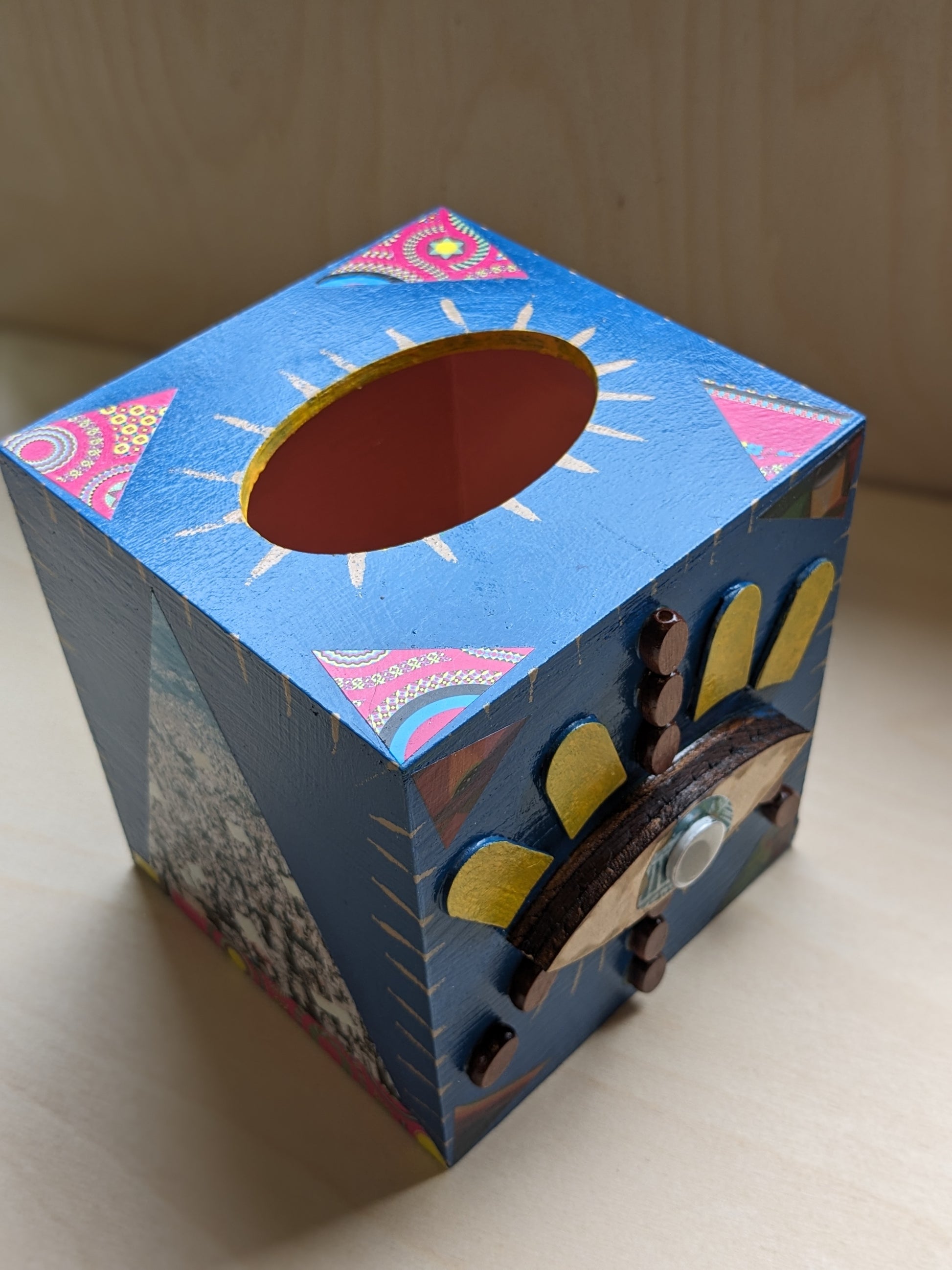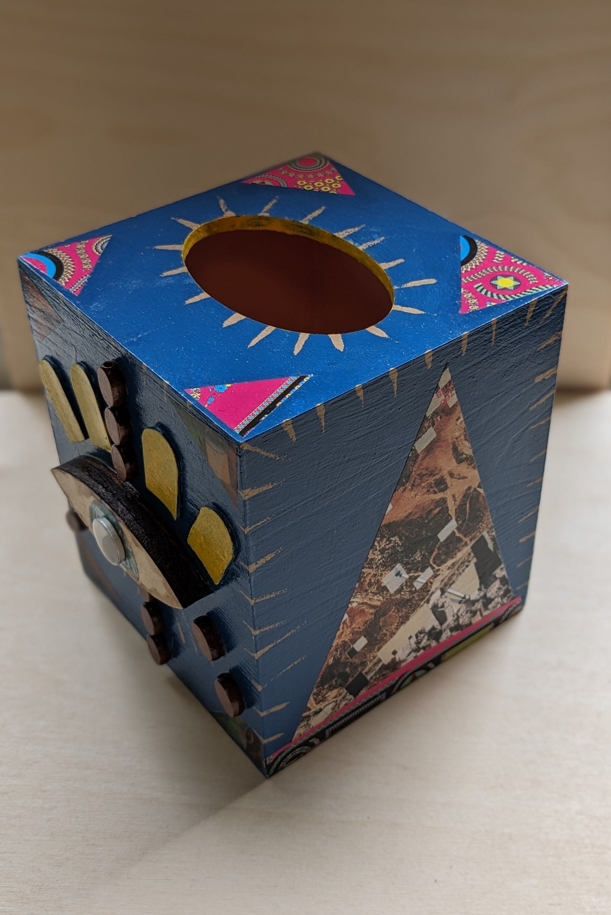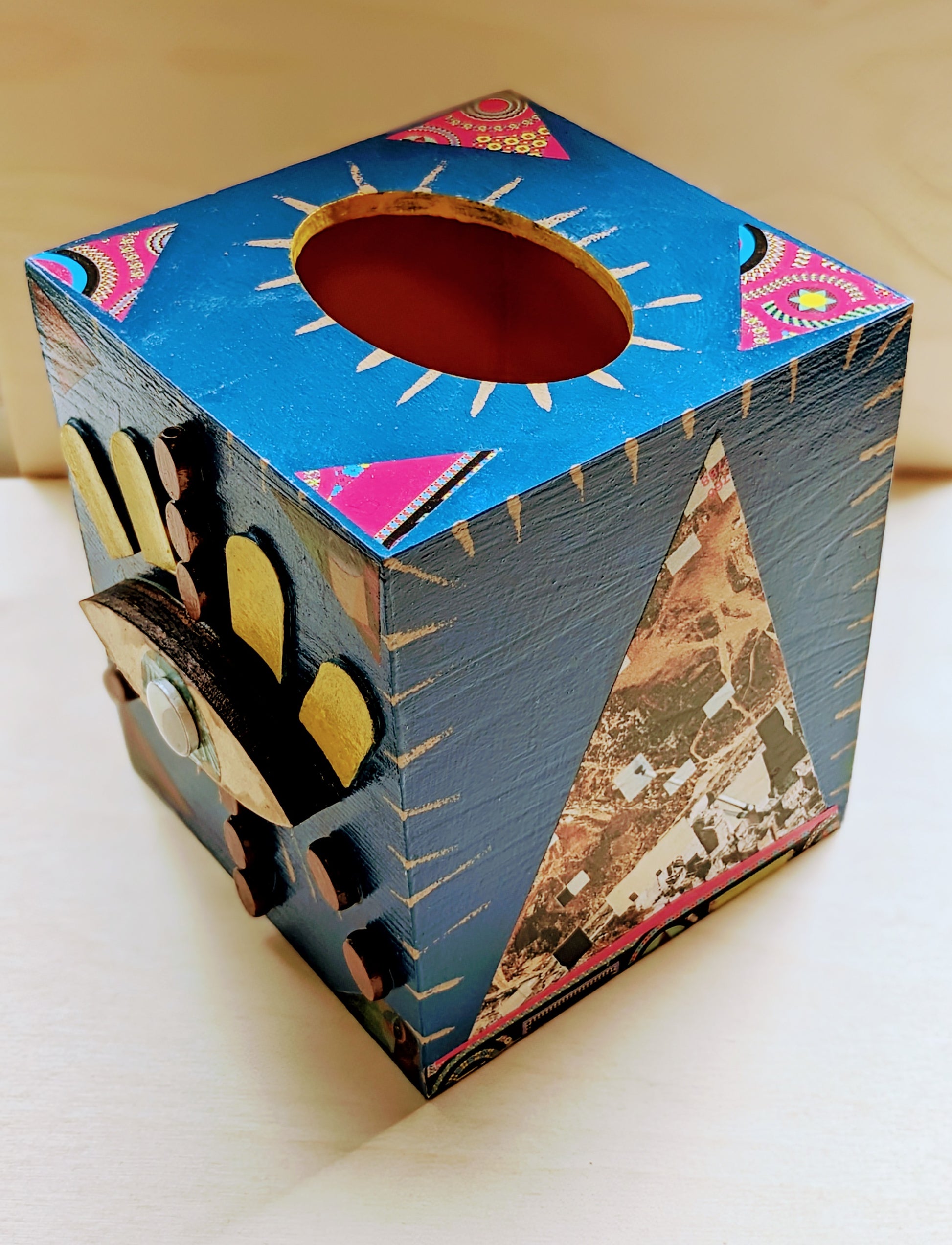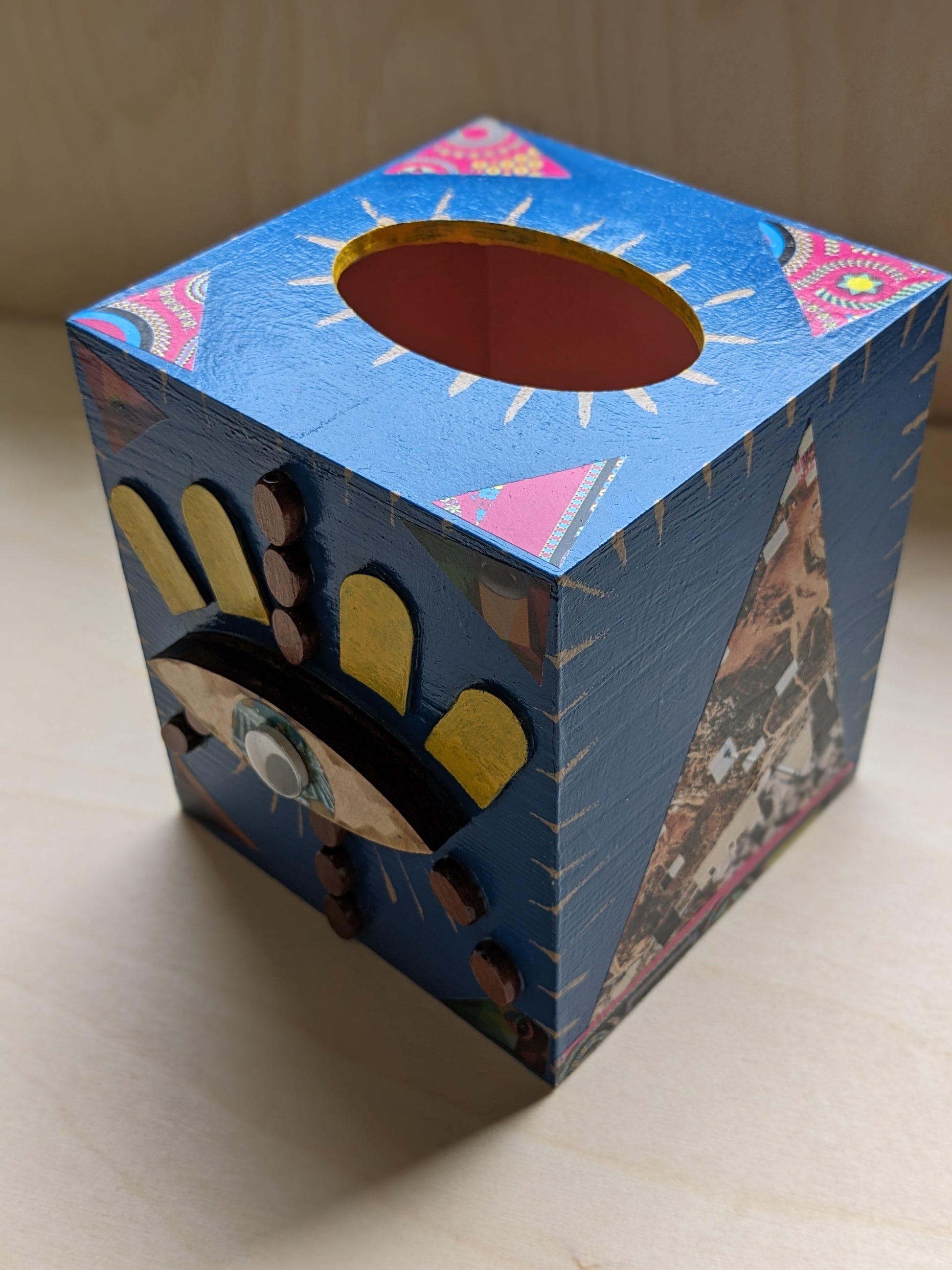 Upcycled hand painted decoupaged tissue box, vintage art magazines and found wood pieces.