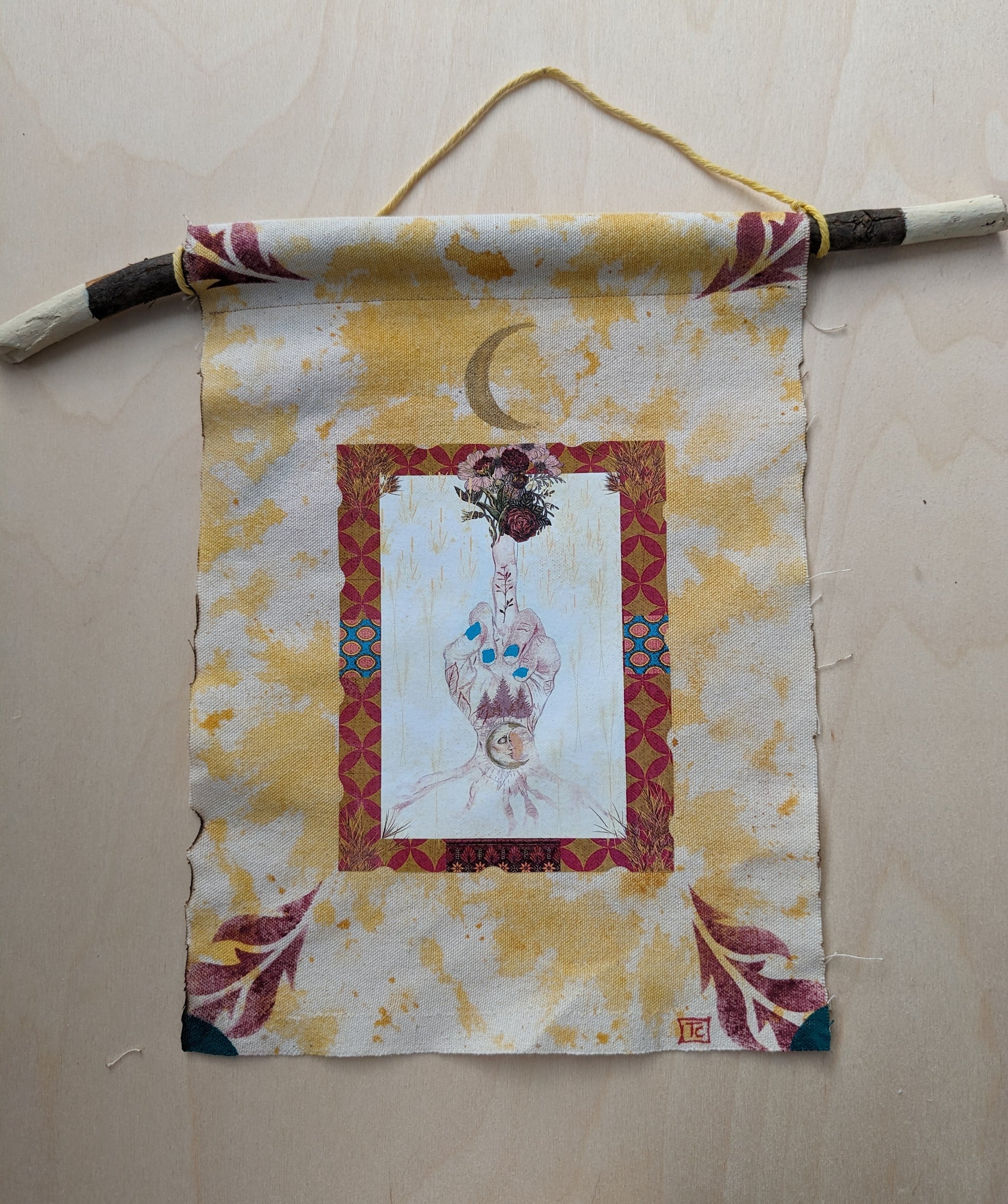 original design heat transferred on Turmeric dyed canvas & string. Painted with eco friendly water based paint, wood found with the help of my pup.